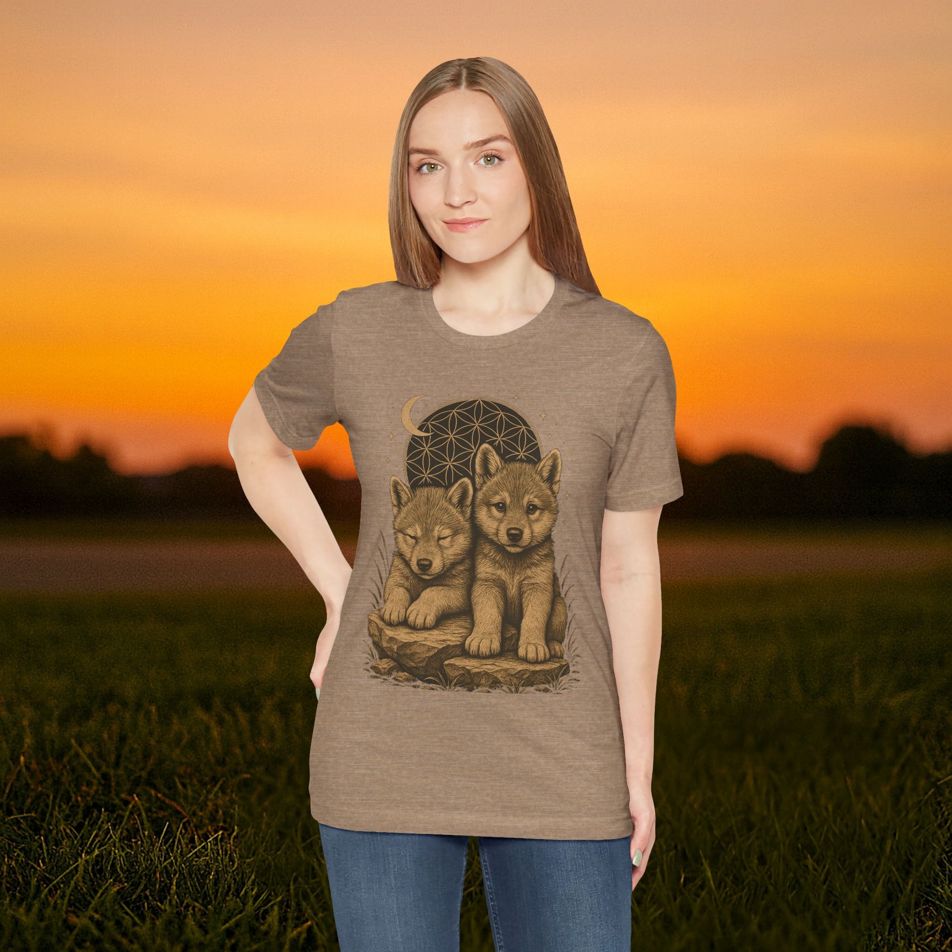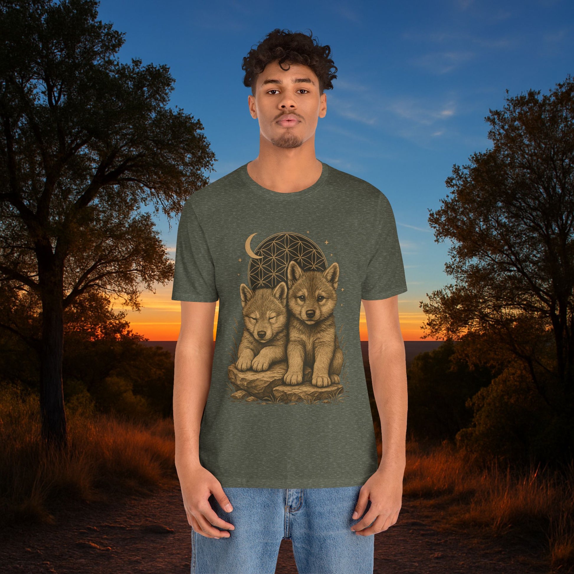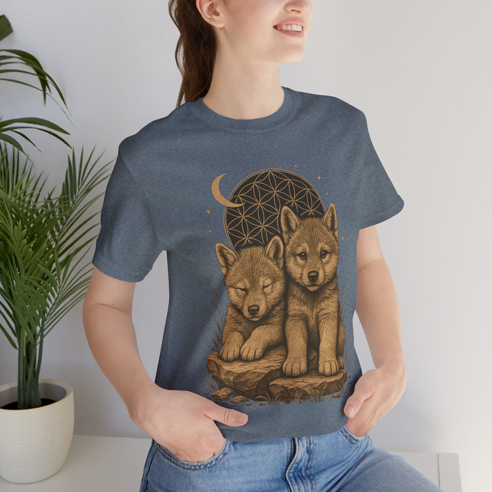 Two wolf pups under the moon, one awake and watchful, the other resting in quiet trust. The Flower of Life rises behind them, stars scattered above, grounding rock beneath. This design carries both innocence and wild spirit — a timeless seal of balance and protection.