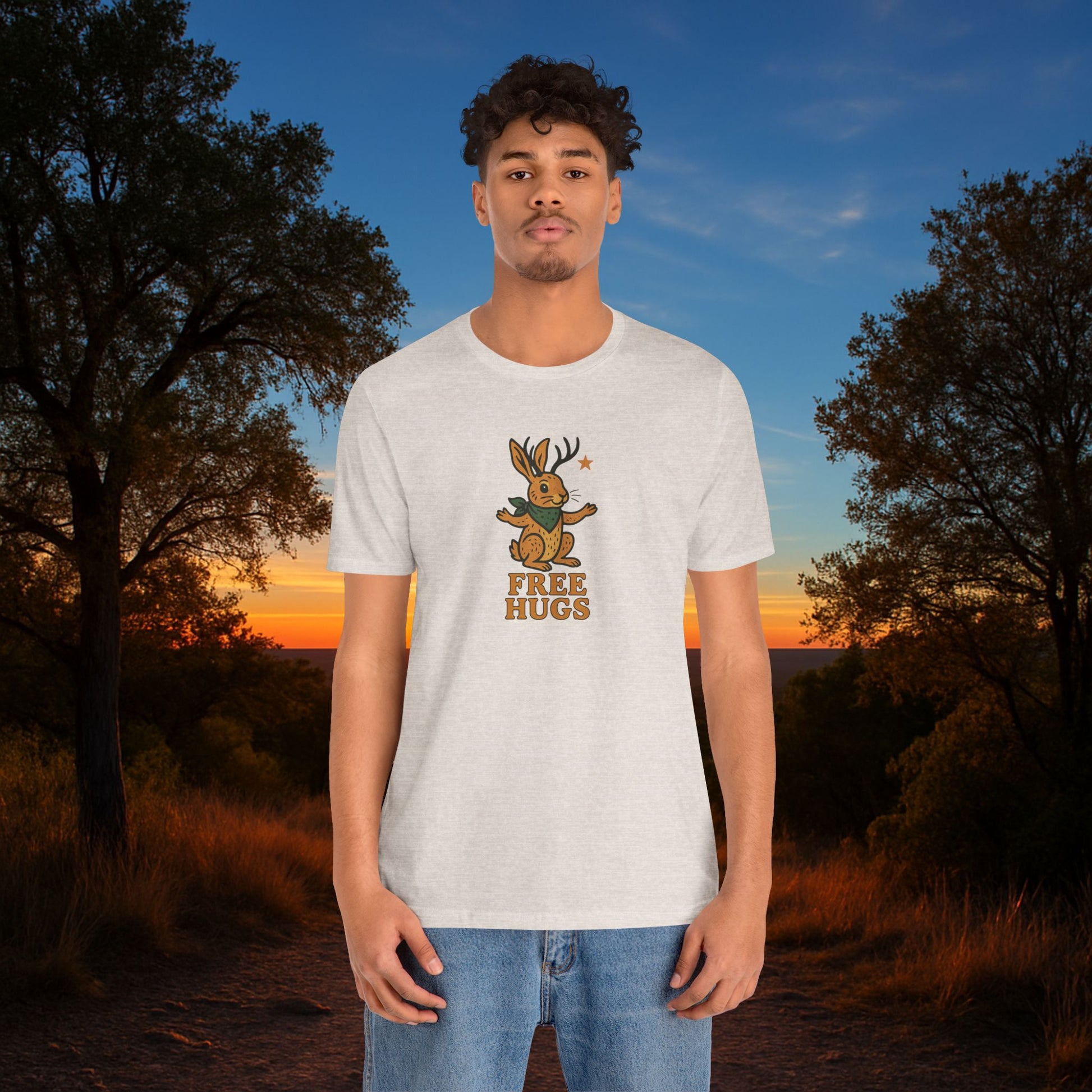 Bring a little humor and Texas folklore into your wardrobe with the Free Hugs Jackalope Tee. Featuring the mythical jackalope offering wide-open arms and rocking a green bandana, this playful design is equal parts quirky and inviting. Soft, comfortable, and perfect for casual wear, it’s a fun conversation starter whether you’re out on the town or lounging at home. Free hugs included (antlers optional)