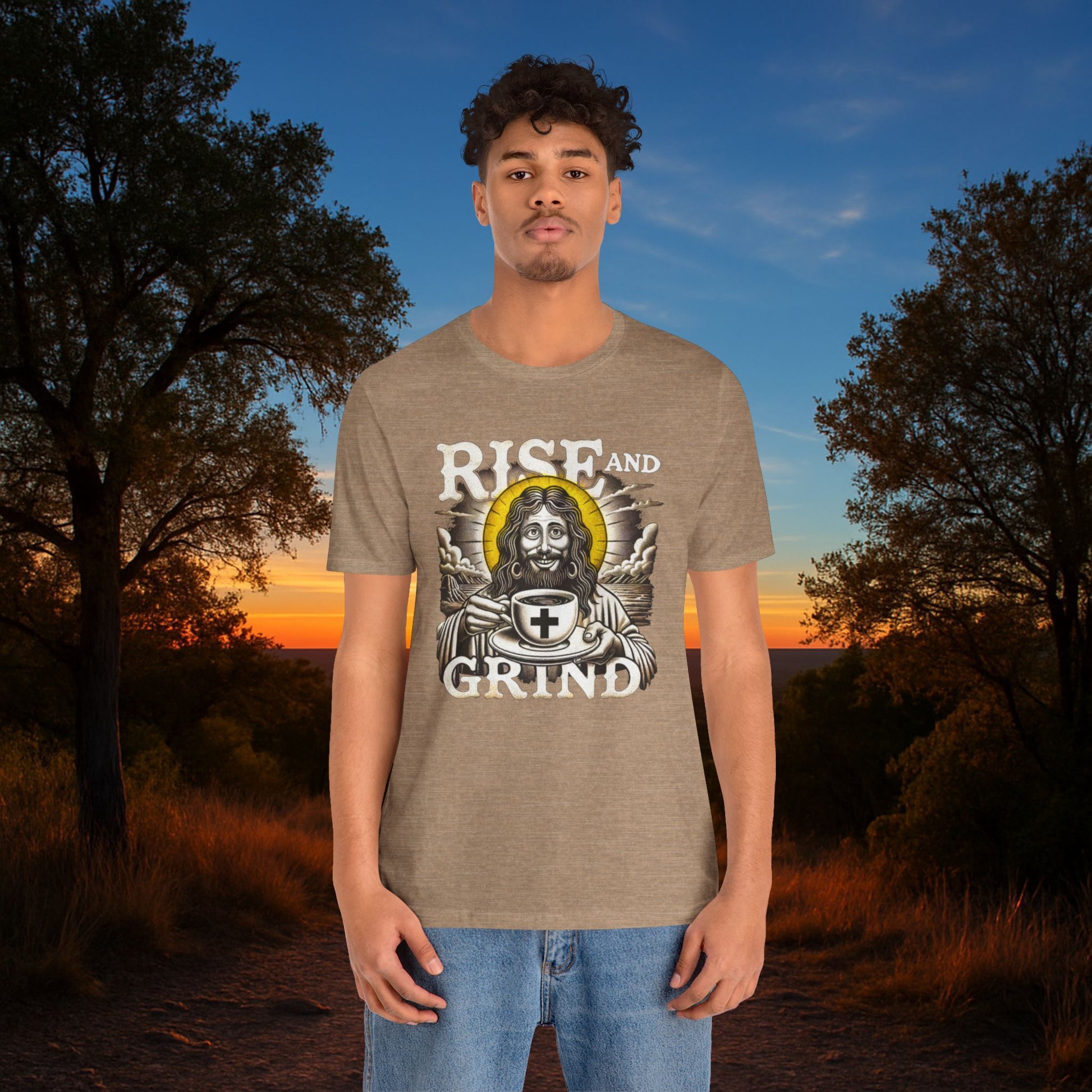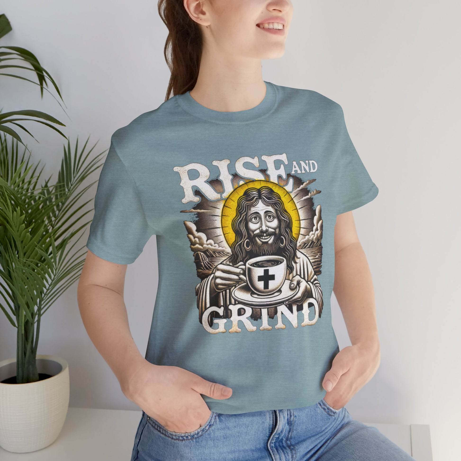 Start your mornings with a smile and some holy caffeine in the "Rise and Grind" tee. Featuring a playful, comic-strip-style Jesus sipping coffee, this shirt blends faith, humor, and a daily dose of energy. This tee is your reminder that coffee and prayer make the perfect blend. Light, bright colorways keep the design fresh and uplifting — the perfect day shirt for coffee lovers, keyboard warriors, and anyone who likes a little divine comedy with their grind.