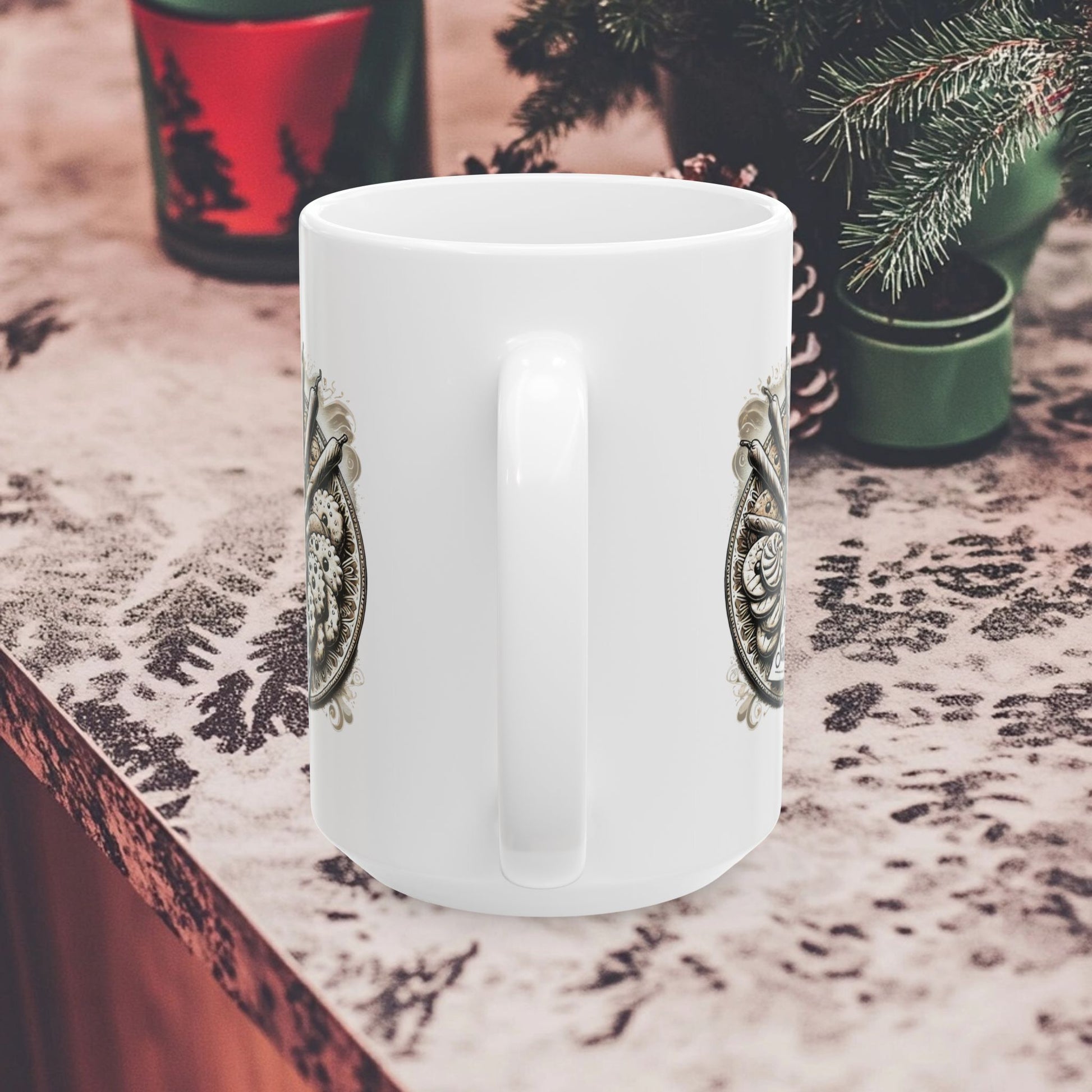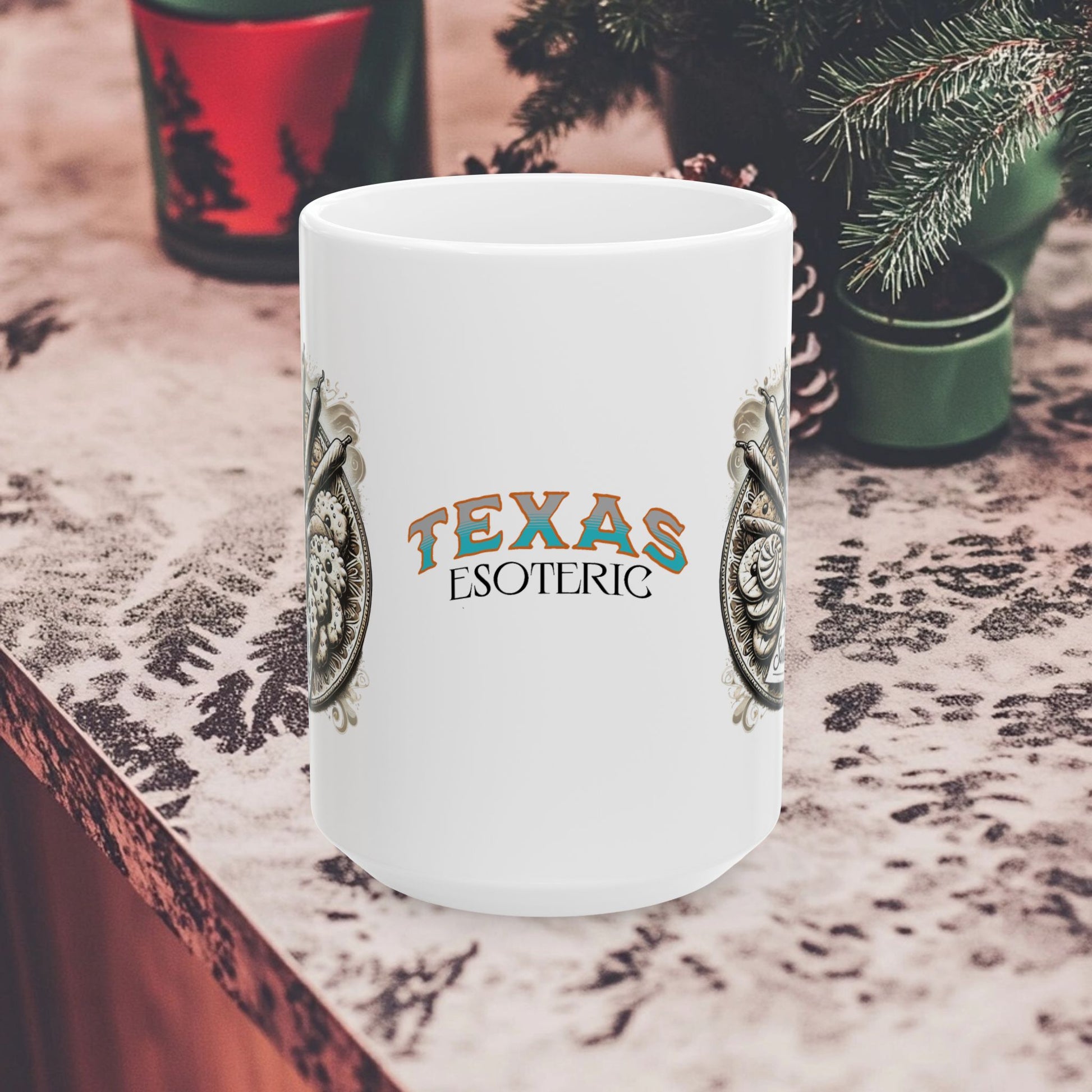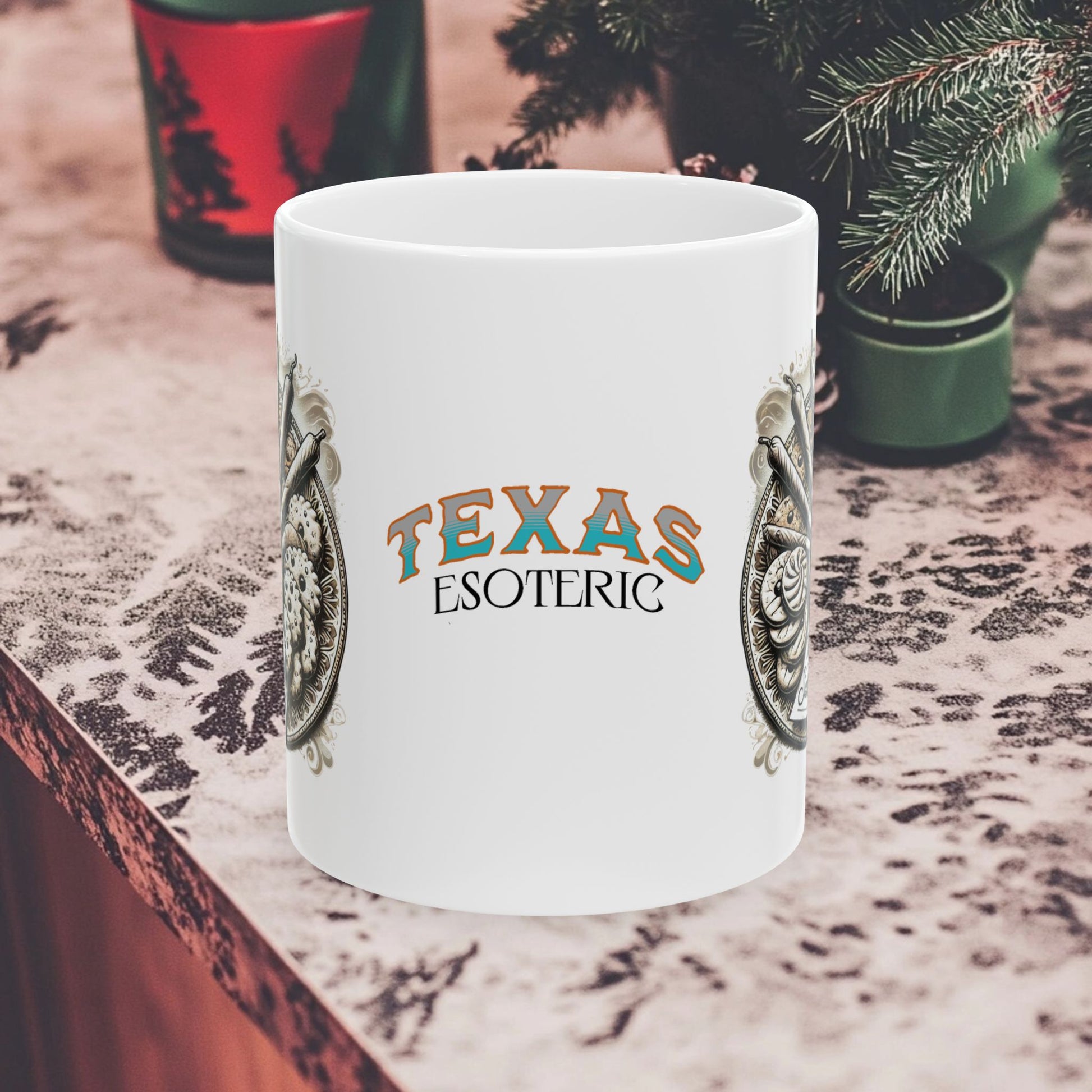The design is elegantly neutral with just a hint of color, allowing the playful details to surprise and delight. Separating the two identical sides of the mug is the Texas Esoteric logo in earthy tones of orange and turquoise, tying the festive spirit to your favorite Lone Star vibes.