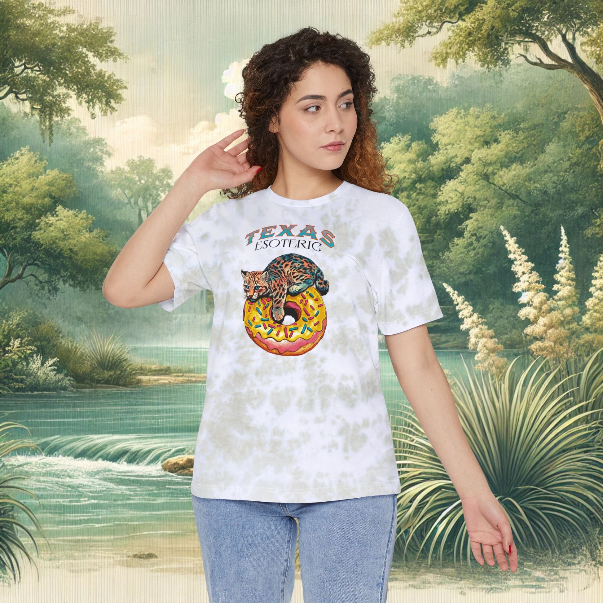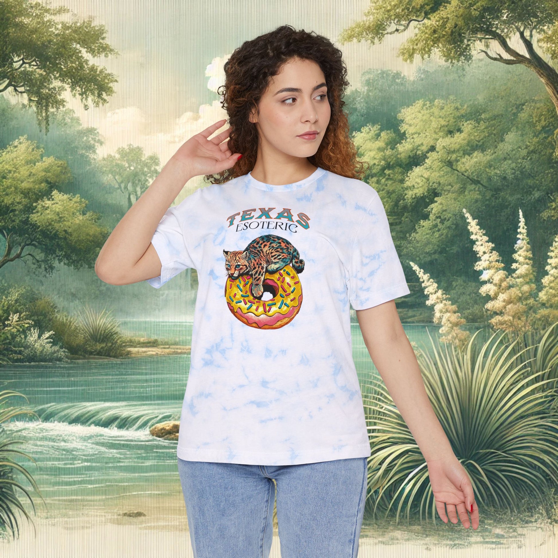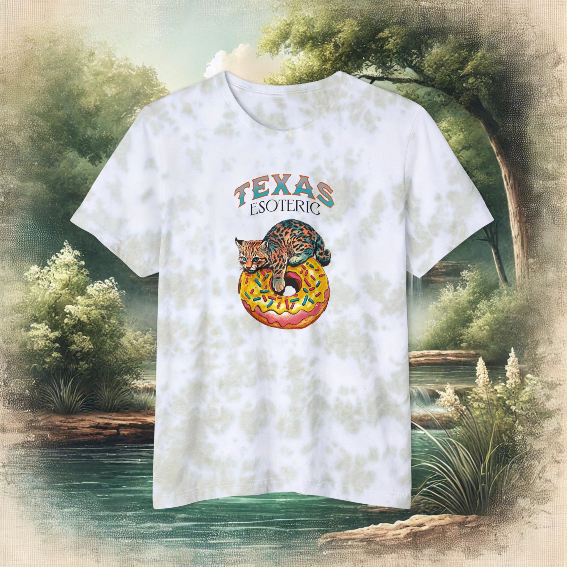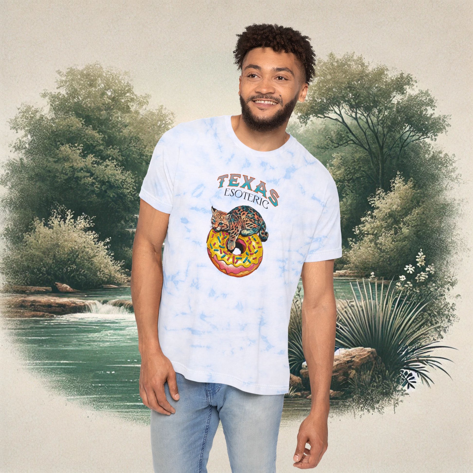 This Tie-Dye Tee features a playful illustration of Baby Randy the Bobcat relaxing on his donut, perfect for those who appreciate whimsical charm and laid-back Texas flair. Made from soft, breathable cotton, this shirt is ideal for sunny days or outdoor adventures. Suitable for Hill country wanderers, nature enthusiasts, and those who love a bit of Texas Esoteric charm. Perfect for casual wear or as a statement piece for special occasions.