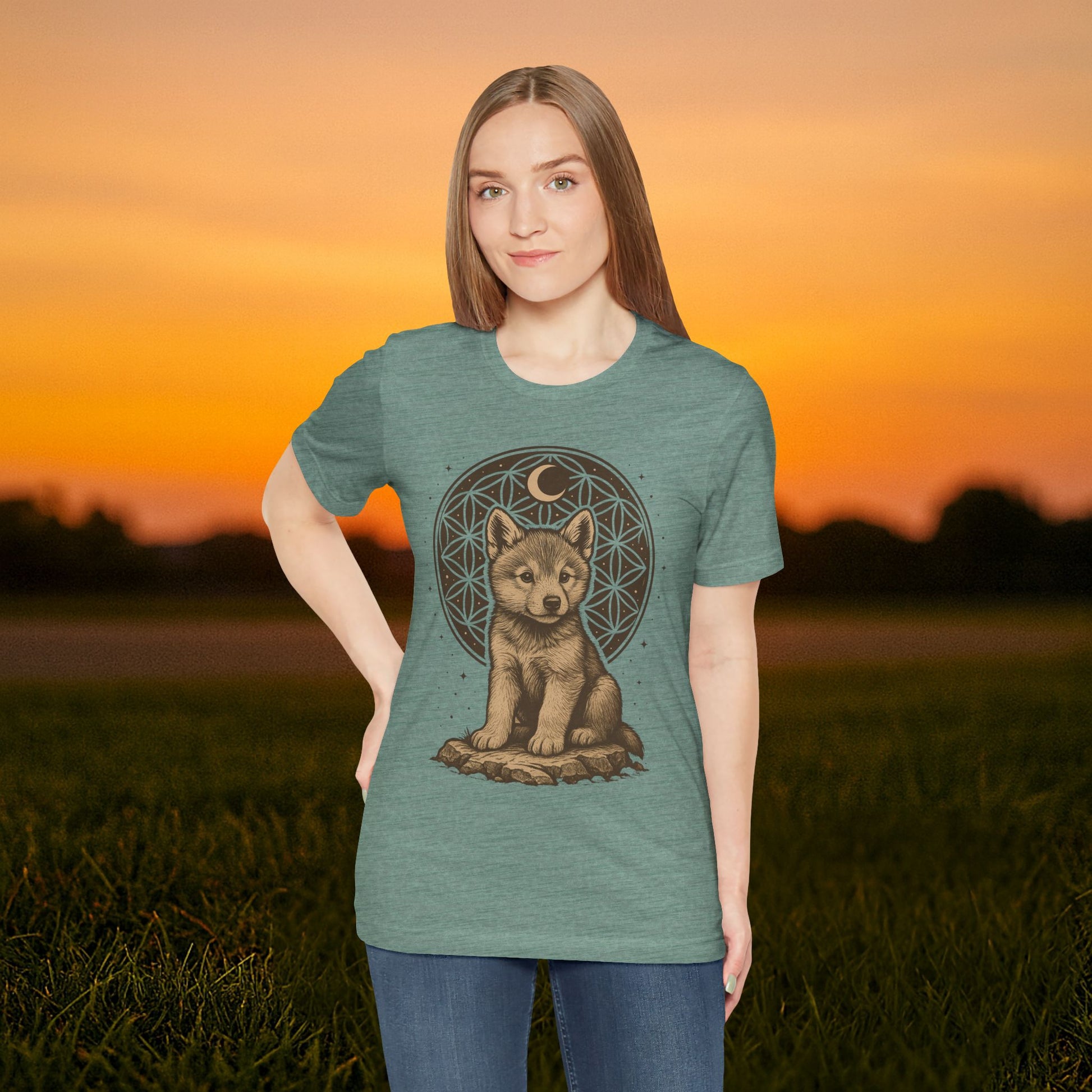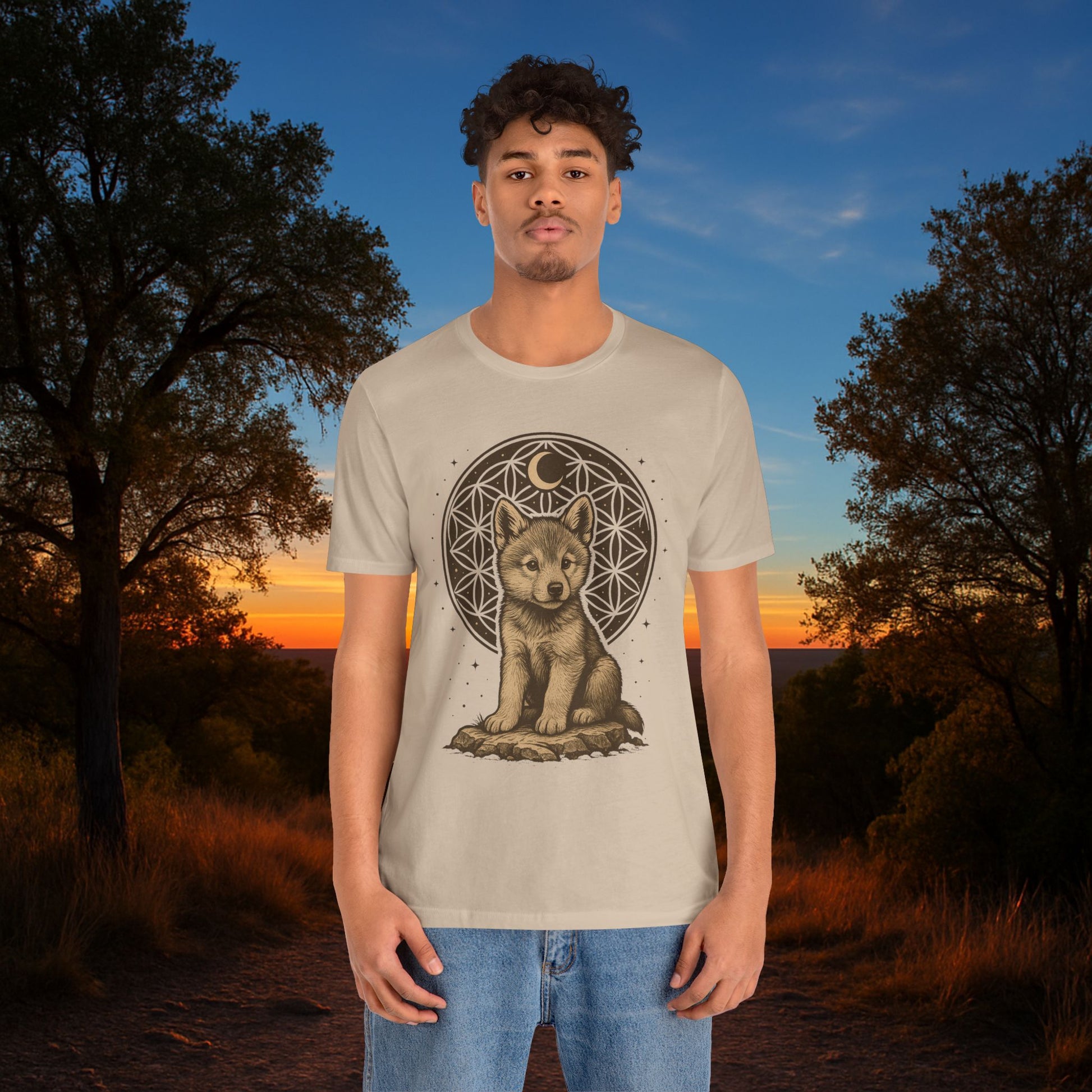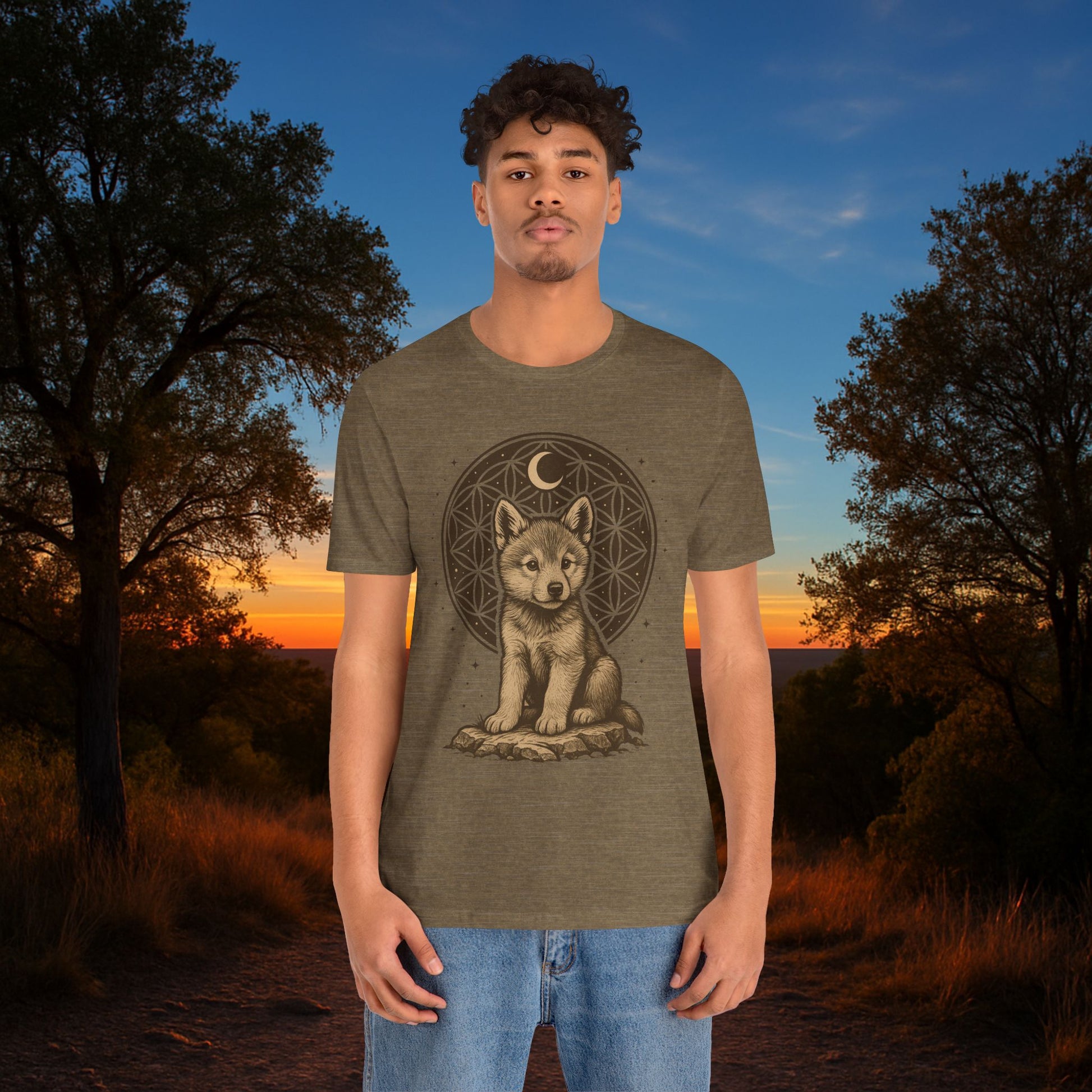 One pup. Sitting calm, eyes open, framed by the Flower of Life and the crescent moon. Pure innocence, grounded in the wild. The "Solo Wolf Pup" Tee is simple, iconic, and timeless — a true Texas Esoteric seal.